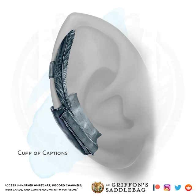 While wearing this platinum ear cuff, any audible sound or spoken language that you’re within earshot of is magically transcribed, appearing as unobtrusive, illusory text that only you can see in the corner of your vision. While wearing the cuff, you gain a +2 bonus to Wisdom (Perception) checks that rely on hearing, even if you’re deafened, as you can sometimes read the transcriptions of sounds that are otherwise inaudible. The transcriptions are written in Common, and vary in size and form depending on the nature of the sound. The text conveys the literal meaning of any spoken language that it transcribes, but can suggest similar Common idioms in place of the ones it translates from other languages. You can choose to ignore certain sounds and transcriptions, causing the text to vanish, in order to better focus on the ones you’re interested in.